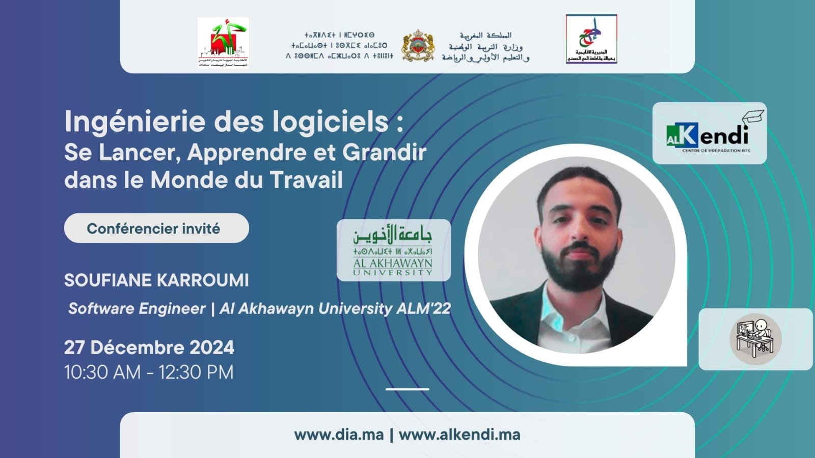 Le 27 décembre 2024, le Centre Al Kendi a eu l’immense honneur d’accueillir Soufiane Karroumi, ingénieur logiciel et ancien élève de l’Université Al Akhawayn, pour une conférence enrichissante intitulée « Ingénierie des logiciels : Se lancer, apprendre et grandir dans le monde du travail ». Ce jeune ingénieur, actuellement employé chez HPS ,une entreprise spécialisée dans les solutions de paiement ,a captivé son auditoire par son expertise et son expérience, marquées par une détermination sans faille et un parcours académique remarquable.